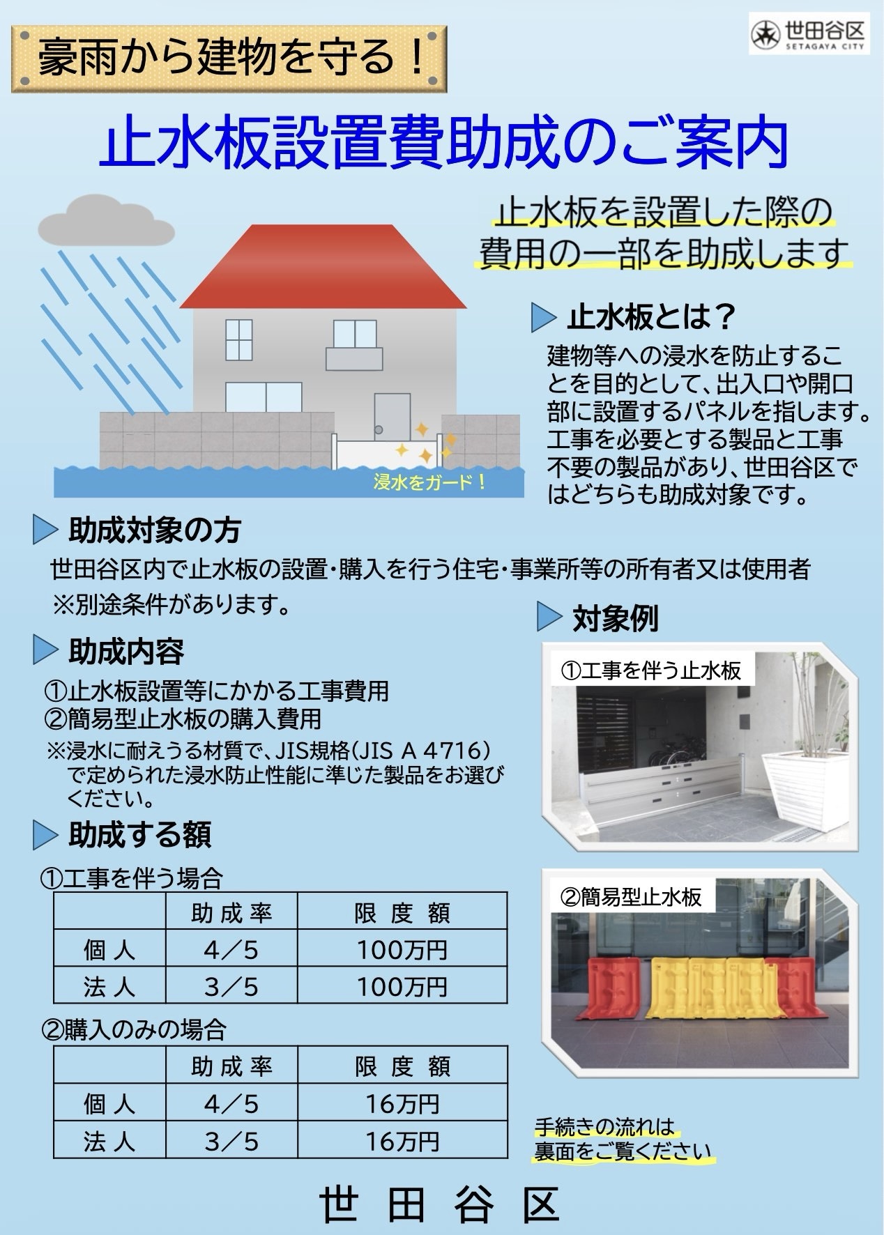 平成30年・令和2年に【止水板設置への助成】の質問をしましたが、今年度から世田谷区では、止水板設置の助成制度が始まっております。